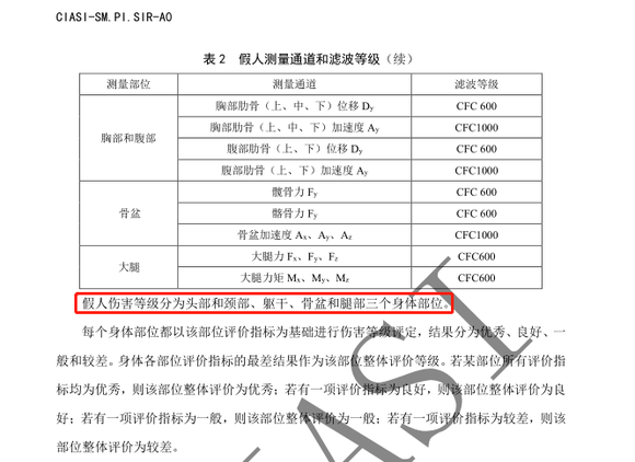 其实根据《CIASI-SM.PI.SIR-A0》测试标准,侧碰测试不仅仅是关于B柱变形量/断裂的考核,还会针对假人进行详尽的受伤害考核。具体来说,就是会把假人伤害分为头部和颈部、躯干、盆骨和腿部三个身体部分去考核。