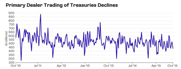 彭博社援引纽约联邦储备银行的数据称,今年以来,一级交易商对美国国债的日均交易金额为4920亿美元,低于五年来5320亿美元的平均水平。