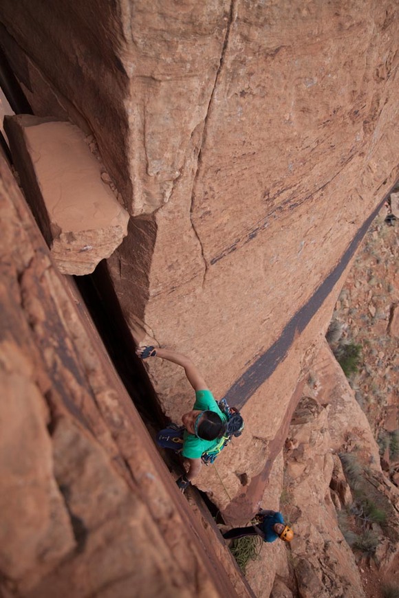 路书上说“灵境追寻”是条很硬的路线(A burly route),光看难度级数,它不起眼,只有5.10d,但在很多资深的攀岩者眼里,这条路线很不简单。一位在摩押当向导的朋友,几乎爬遍印第安溪所有岩壁,在砂岩上可以传统先锋到5.13的,也啧啧说这条路线会比想象中更硬。