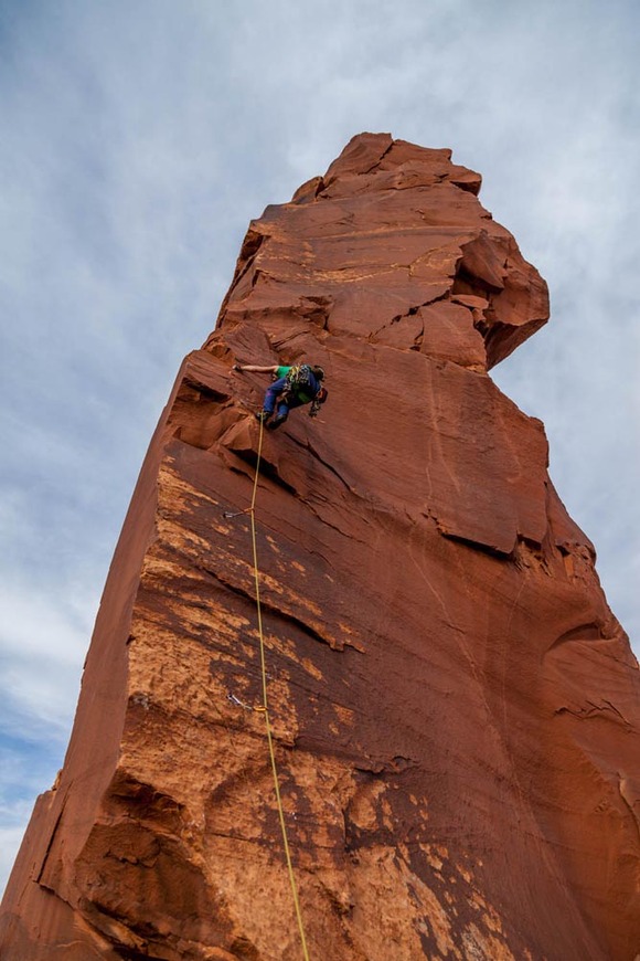 拇指姑娘的“学着爬” (Learn to Crawl)线路虽然不长,只有一个绳段,50米,但难度有5.11c,属于face climbing(在岩石表面攀岩),是犹他地区砂岩构造的岩壁少有的线路类型。