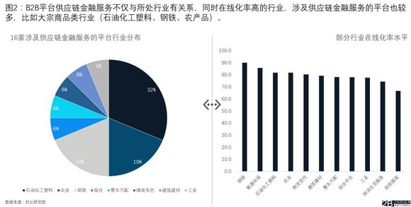 如果结合我们托比研究院第一版的B2B交易平台在线化率评估模型,就会发现在线化率高的行业,涉及供应链金融服务的平台越多,这在一定程度上呼应了我们上篇文章中——“B2B平台在线化率水平越高,在提供供应链金融方面优势越明显”的观点。