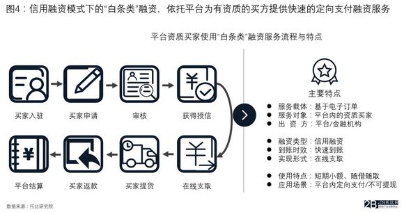 “白条类”金融服务属于基于电子订单而产生的无抵押纯信用融资服务,一般是B2B平台为有资质的买方提供即期在线金融贷款用于平台内采购商品(服务),满足客户“先提货、后付款”的诉求,减轻买方资金压力。主要特点是:纯信用、到账快、在线支取、短期小额、定向使用。