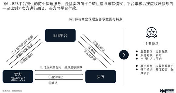 B2B平台提供商业保理服务,是指供货商(卖方)向B2B平台转让对核心企业(买方)的应收账款债权,B2B平台核实真实性后,按应收账款额的一定比例为卖方进行融资,卖方每月付息,待买方结清应收账款后,B2B平台返还给卖方差额。在此过程中,B2B平台还为卖方提供应收账款账户管理、催收等其他服务。由于保理业务B2B平台需要为卖方贴现,因此对于平台本身的资金实力和风控能力有一定考验。