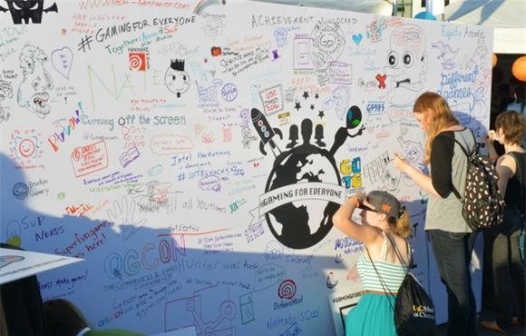 从前文的描述来看,或许有人会认为说明理念是一件严肃甚至死板的事情,但实际上并非如此,从照片就可以看出来现场气氛非常悠闲。小孩子、大人、男扮女装的、女扮男装的等等有各种各样的人(模糊了性别是IndieCade的重要主题之一),大家都在尽情地玩自己喜欢的游戏。“这是用xxxx来表达xxxx。”“啊,原来如此”这样打官腔的人可是一个都没有喔。