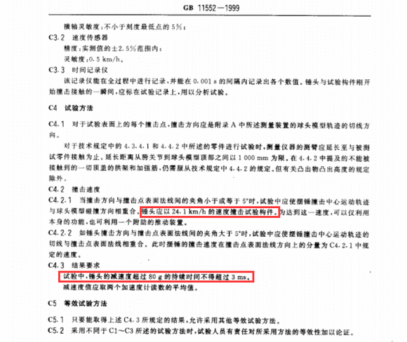 锤击速度24.1km/h,大概就是快速骑着山地自行车头部撞击墙面的效果。减速度超过80g的持续时间不超过3ms,可以理解为希望能够快速吸能,不要出现硬碰硬(越是硬碰硬,大力撞击的持续时间越长)。
