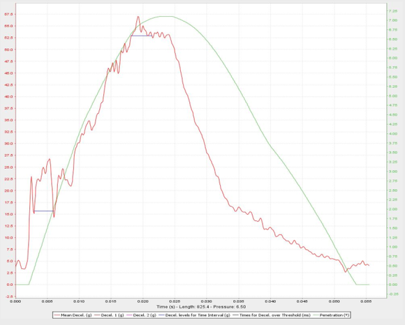 比如下图这种测试结果就比较理想,没有出现减速度超过80g的时候,并且超过53g的时间控制在4ms左右。