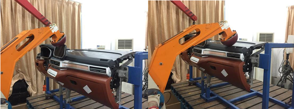 具体做法是用模拟锤头以24.1km/h速度撞击仪表板(副驾驶位区域),来观察仪表板是否会出现凹陷或碎裂,导致尖角、棱边刺伤乘员头部。同时还要需要满足头部的减速度超过80g的持续时间不超过3ms。