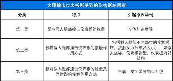 综合各因素分析,大腿撞击仪表板所受到的伤害影响因素大致可归纳为三类: