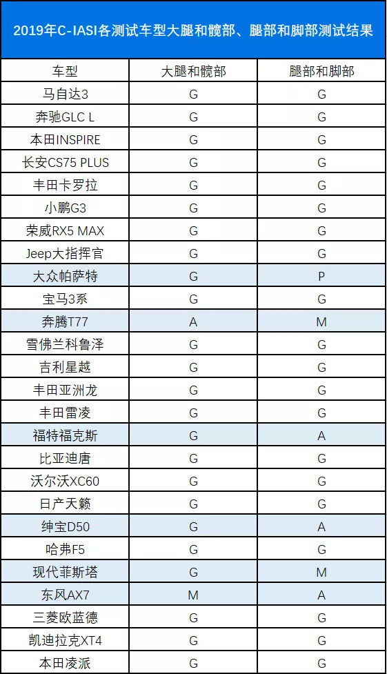 针对这个问题,我统计了2019年C-IASI各测试车型(正面25%偏置碰撞)大腿和髋部、腿部和脚部测试结果。整体情况让人满意,不过也有像帕萨特、奔腾T77、东风AX7等车型的表现不理想。