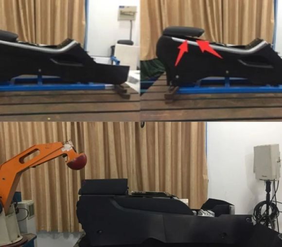 我们说的副仪表板头碰,是为了防止后排中间位置乘客遇到追尾时,头部撞击副仪表板后盖板而设计的一项测试,它的撞击速度也是被设定在24.1km/h,测试要求扶手对头部模型的减速度超过80g的时间不得超过3ms,不能有可致人严重伤害的凸起。