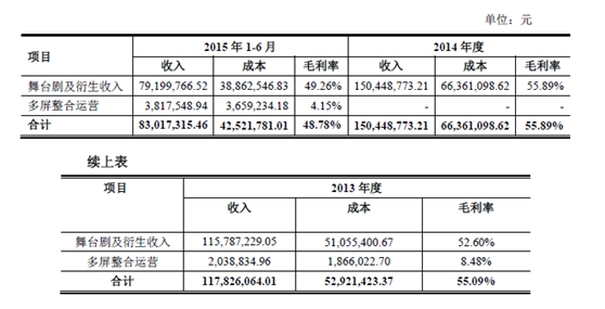 看下收入来源。公司2014年实现收入1.5亿,毛利率维持在55%左右(2015年上半年由于淡旺季之分故毛利率略有降低)。其中主要收入还是来自舞台剧以及衍生剧,此外多屏收入主要是自制剧的收入。开心麻花的舞台剧是其主要作品,根据演出行业协会统计,2014年,全国话剧演出总场次为1.17万场,比2013年上升4.46%,平均票价285元,比2013年上升13.10%,票房收入19.14亿元,居剧场演出票房首位,因此话剧的市场空间还是很大的。而开心麻花的优势就在于其有一套完整的剧本产生以及演出体系,公司共有21部独立原创的舞台剧IP,包括《乌龙山伯爵》、《江湖学院》、《夏洛特烦恼》、《旋转卡门》等热门剧集,此后改编成电影或者网络衍生剧都大有可为,此次国庆档的电影试水也为衍生的电影业务开拓了极大的市场。而公司在网络剧方面早在2012年起就与乐视网联合推出了国内首部周播网络情景喜剧《开心麻花剧场》;2013年,公司开始与黑龙江卫视合作尝试短播栏目剧,打造了《开心麻花街》节目。电视+网络+舞台剧,手握21部IP剧,何愁今后发展。