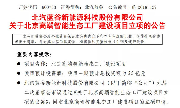 早在2018年12月北汽蓝谷曾发布过关于北京高端智能生态工厂建设项目立项的公告,估算占地面积、投资预期,提及「土地、厂房、公用设施等投资拟计划由政府承建,北汽新能源有偿租赁使用」。