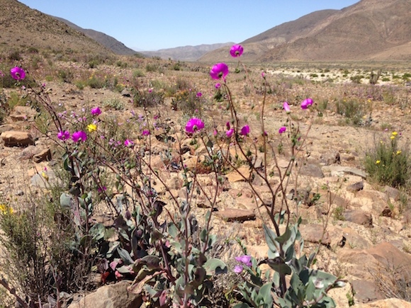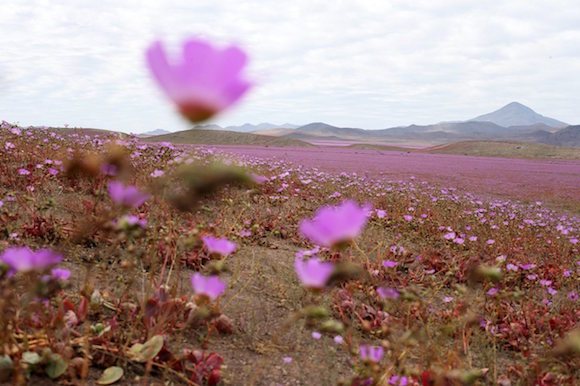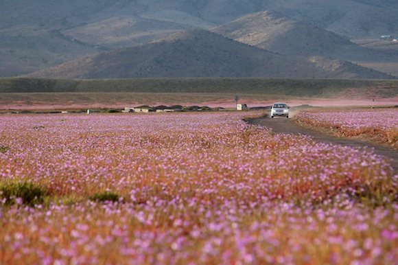 但是,因为今年的厄尔尼诺现象,过去几个月里这里竟然下起了久违的大雨。时隔18年,沙漠里的花终于绽放……