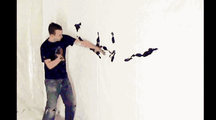 接下来的尝试是疯狂的。他用字母代替点,用身体代替画笔,用其它物品实现点阵的涂鸦。