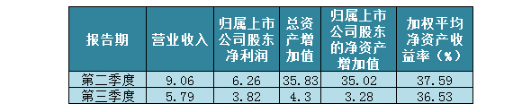 从上表中不难看出,与第二季度相比,公司第三季度营业收入、归属于上市公司股东的净利润均大幅下滑,环比分别下降36.09%、38.98%;公司总资产增加值和归属于上市公司股东的净资产增加值更是相差10倍左右,加权ROE也降低了约一个百分点。