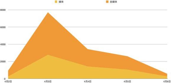 从2020年4月2日21:30(美国时间4月2日美股开盘时间)至2020年4月6日10:20,关于“瑞幸咖啡”的互联网舆情报道共计15369条(去重后)。其中4月3日舆情达到高峰,当日全媒体报道7739篇,其中媒体2781篇,自媒体4940篇,而后随着时间推移逐渐降温。
