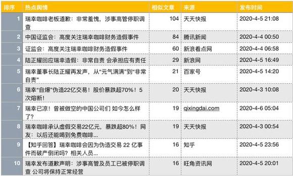 随着瑞幸咖啡事件持续发酵,目前多方都做出了表态和回应,其中传播最为广泛(相似文章数最高)的前十名舆情报道如下图。内容主要围绕“老板道歉”和“证监会关注”,还有的关于“被做空的中国公司”等。