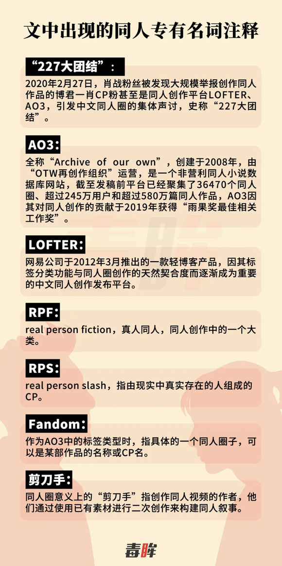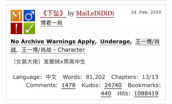 最近一次同人圈的大型出圈源于“227大团结”和AO3被墙事件后。作为事件导火索的王一博、肖战同人文《下坠》在同人创作平台AO3上引发了网友的慕名围观,并最终点阅率过百万,超越其文本意义、被动地成为了AO3平台上的“第一中文同人”。