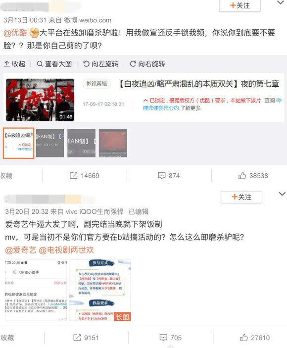 而这又引发了另外几重讨论:同人创作者的“为爱发电”无形中成为了资本的廉价劳动力是否公平?近日版权平台在剧集宣传期结束后大量下架B站上同人视频的举措,也引起了同人圈的抗议之声,同人创作者认为平台方的“过河拆桥”、“卸磨杀驴”令他们心寒;但在版权归属的角度上,同人创作的确是一个模糊地带,客观存在被下架的风险。