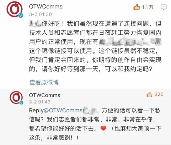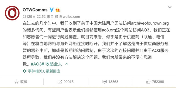 OTW再创作组织就中国大陆用户无法访问AO3情况回应
