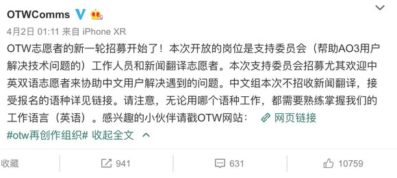 4月2日,OTW开始新一轮志愿者招募,和以往志愿者招募微博下冷清的转评数不同,这一次颇为热闹,被评论转发了上千次,当然,大部分的留言谦虚地表示:“抱歉我的英语不配,只能在评论里叉会儿腰了。”
