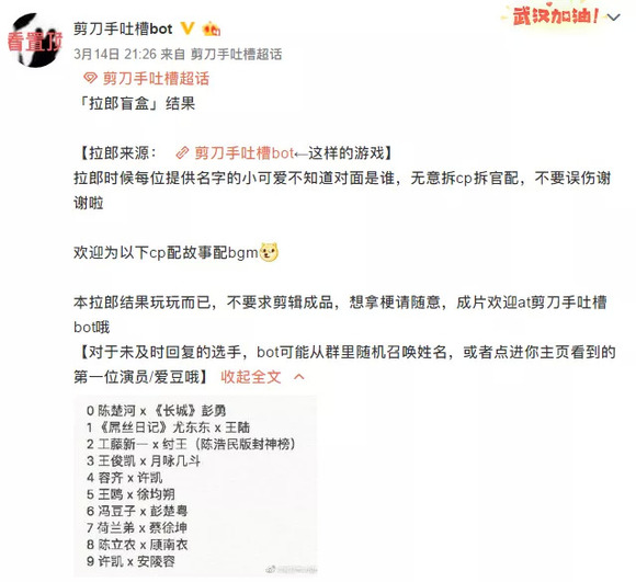 bot也坦承忙起来的时候简直“每天都想弃号”:“工作学习忙的时候还惦记着清稿,打开微博将近一百待清理条投稿,很头大。还有很多想吐槽的问题,比如不阅读投稿指南就来投稿的、伸手党、大量重复内容的投稿,将饭圈规矩带进剪刀手圈之类的。但是想放弃的时候又会想到很多人会伤心,想吐槽的时候,可能就会发一些粉丝可见的微博,或者在粉丝群里吐槽,经常会得到粉丝的共鸣,或者收获一些改进的意见。”
