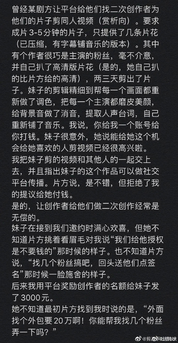 同人二创视频也日益成为娱乐行业中一种“物美价廉”的剧宣方式:一部剧的官方微博常常以主演签名照和不多的奖金作为犒赏,号召剪刀手们为剧集创作同人视频。