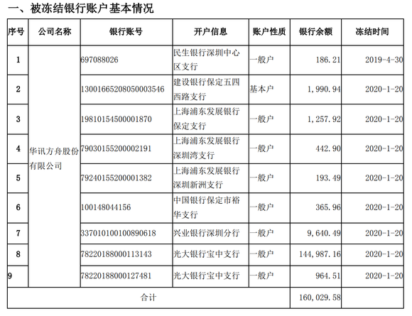 1月23日,华讯方舟又披露自己的部分银行账户被冻结的信息,合计有9个账户,虽然银行余额不多,但终究不算好事。后来在2月27日,华讯方舟再披露一批被冻结的账户,共计13个,涉及金额近2000万元。