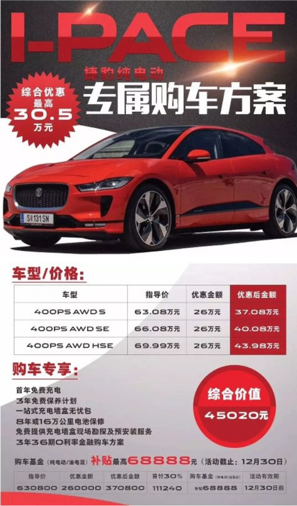 倘若海报中的信息为真,则意味着I-PACE在当时就已拥有5.8折左右的优惠幅度。