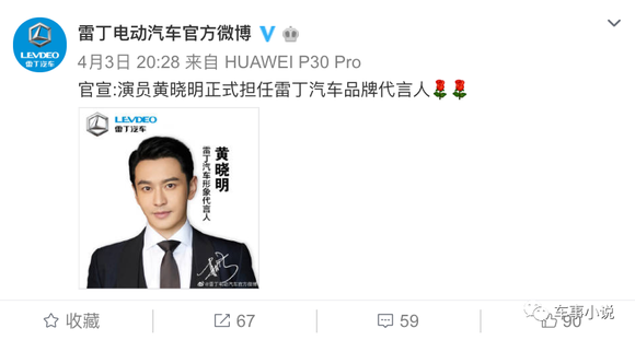 车事小说在雷丁汽车官方微博留意到,在4月3日,雷丁汽车就已经官宣:演员黄晓明正式担任雷丁汽车品牌代言人。根据该官方微博账号认证信息显示,雷丁电动汽车的公司主体则为山东梅拉德能源动力科技有限公司。