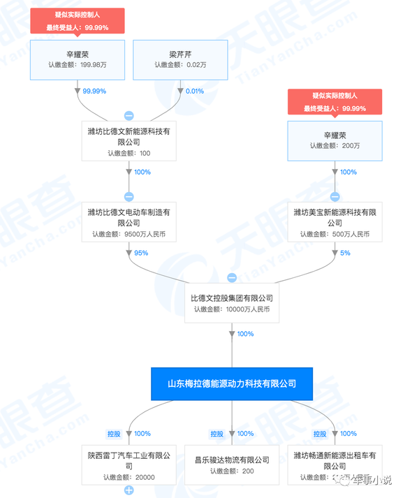 通过股权穿透显示,山东梅拉德能源动力科技有限公司由比德文控股集团有限公司100%控股持有。通过进一步股权穿透后,公司背后实际控制人则为辛耀荣。其名下拥有4家在业状态公司,通过公司名称可以发现均集中在山东潍坊。