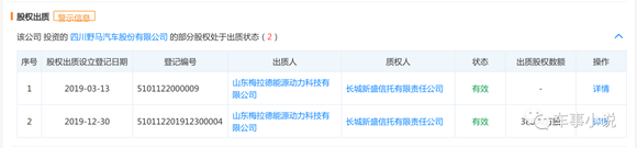 虽然暂不得而知山东梅拉德能源动力科技有限公司出资四川野马汽车的背后逻辑,但根据股权出质记录显示,就在两次出资四川野马汽车的同一天,山东梅拉德能源动力科技有限公司均将相应股权质押给了四川野马汽车的另一位股东——长城新盛信托有限责任公司。