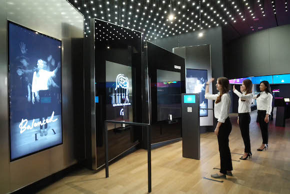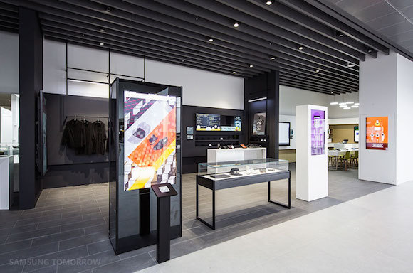 在游客对AR游戏所带来的科技感感到好奇以后,工作人员便会带领他们来到第二层Global Gallery展区,这里主要展示三星的半导体历史、LED技术,以及三星科技在商场、健身房、教室、家居生活等各方面的应用场景。