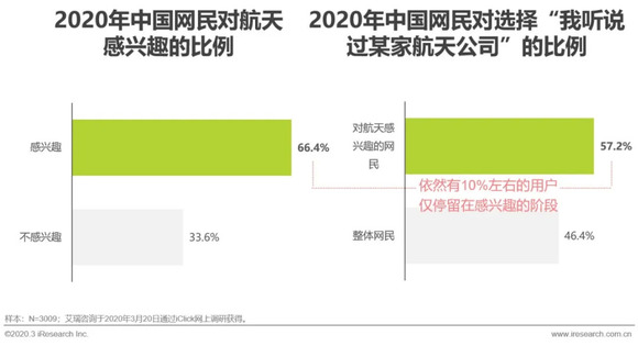 我们以最大的容错率,即听说过这家公司的名字即可为标准来衡量,结果也难尽人意。只有46.4%的网民对这些品牌有认知,好的是,在填写自己对航天感兴趣的用户中,这一比例上升到了57.2%。也就是说,尽管大多数网民,对航天感兴趣,但依然有大概10%的网民,只停留在感兴趣的阶段,并未尝试深入了解。