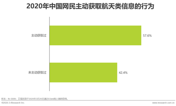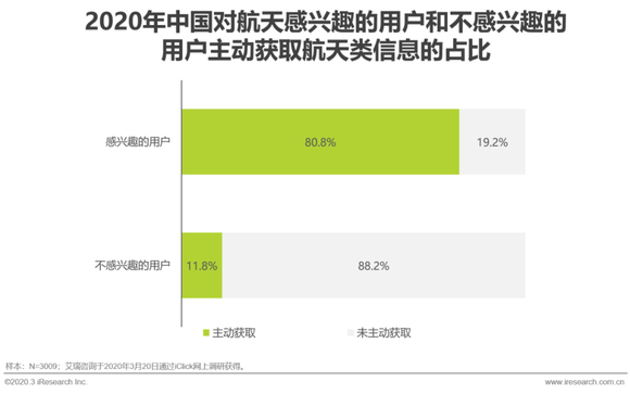 在所有被访对象中,过去一年中主动获取航天类信息的占57.6%,这与全社会对航天的感兴趣程度相吻合。但对于感兴趣和不感兴趣的两类群体而言,其行为差异巨大。在感兴趣的群体中,超过80%的人在过去一年中主动获取过航天类的信息,而不感兴趣的人这一比例仅有11.8%。
