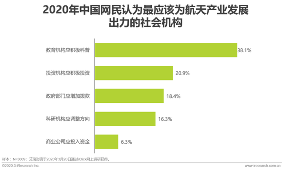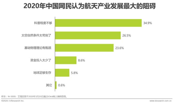 所以42.9%的网民都认为目前航天产业发展的动力源自于国际间的竞争,也就是说在民众心中,尽管航天充满了魅力,但和老百姓毫无关系。同时,34.9%的被访者认为,科普程度不够是当下航天产业发展的最大阻力。动力与阻力之间的断层已经到了不得不解决的节点。