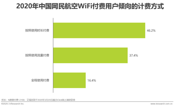 这说明,中国网民具备基础的付费意愿,有助于航司从劣质的免费航空WiFi服务向优质的收费服务过渡。多数用户倾向的航空WiFi付费方式是按使用时长计费,比例为46.2%;同时倾向于按照使用流量付费的比例也达到了37.4%。