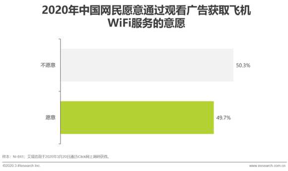 在所有不愿意为航空WiFi付费的用户中,有49.7%的人表示愿意通过观看广告来获取航空WiFi服务。这一比例偏低的原因并非飞机WiFi不重要,而是目前环境下,即便在飞机上上网,网速、服务内容等情况对用户来说也没有太大吸引力。当机上联网已经成为必需品时,这一比例会骤然提高。