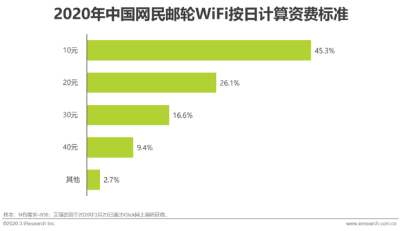 海洋是地面移动互联网无法覆盖的领域,原因时地面移动互联网的实现方式是依靠主干线+基站的方式,而海洋环境中无法搭建基站,所以在海洋中船舶进行通信时只能依靠卫星。但是鉴于邮轮本身的局限性和数量,邮轮WiFi的市场空间并没有航空WiFi大。虽然用户对邮轮WiFi的需求比飞机强烈,但是定价也更为敏感。超过20元的定价将流失近一半的用户。这也从另一个侧面说明,当应用环境丰富以后,用户服务场景间的断层将被拉平,这时用户对流量价格的敏感性就会得到凸显。