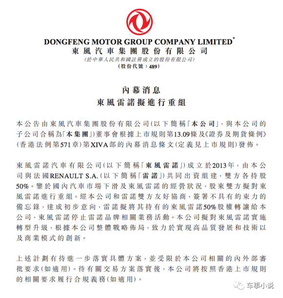 根据东风集团在公告中表示,由于国内汽车市场下滑及东风雷诺的经营状况,股东双方拟对东风雷诺进行重组。经东风集团和雷诺集团双方友好协商,签署不具有约束力的备忘录,达成初步意向,雷诺拟将其持有的东风雷诺50%股权转让给东风集团。东风雷诺停止雷诺品牌相关业务活动。