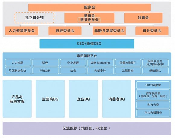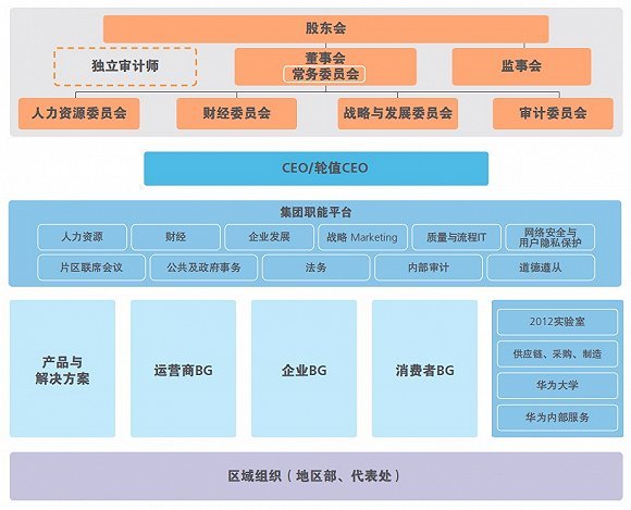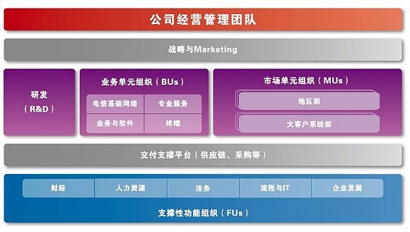 到了2010年的时候,华为成立了企业业务EMT(经营管理团队),开始从运营商客户群体向企业客户群体发展。这一年,原有的市场单元组织变为了平台级的区域组织,区域组织逐步转变为对一线业务单元支持、服务和监管的平台,各业务运营中心在区域平台上以客户为中心开展各自的经营活动。2010年,华为组织架构最大的变化是凸显了董事会与监事会,强化了现代化的企业管理与治理。