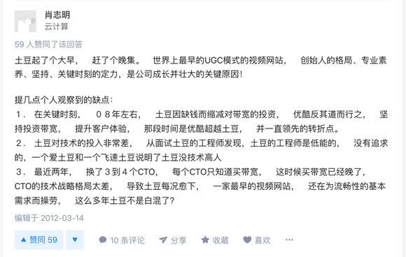 不乏有专业人士认为,土豆早期的技术底层问题,也是其输给优酷的致命缺陷之一;图源:知乎截图