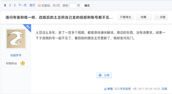 有众多土豆网老用户在大鱼号实施初期,出现丢失账号的问题;图源:百度贴吧截图