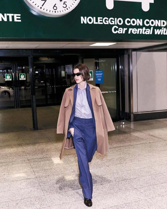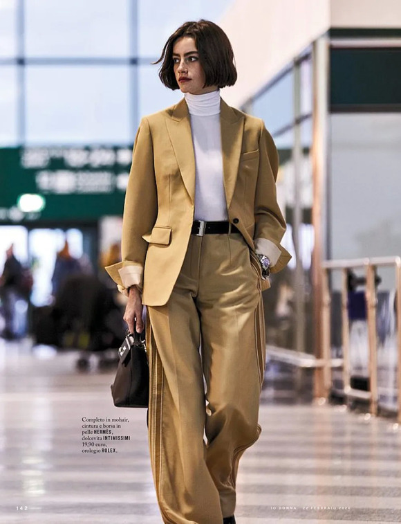 最近逛微博,刷到意大利版《iO Donna》2月刊的机场大片,有被模特穿西装套装+衬衫+平底鞋的look帅到,妥妥的Gentlewoman形象。