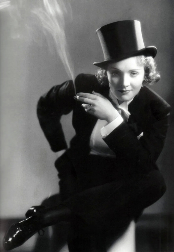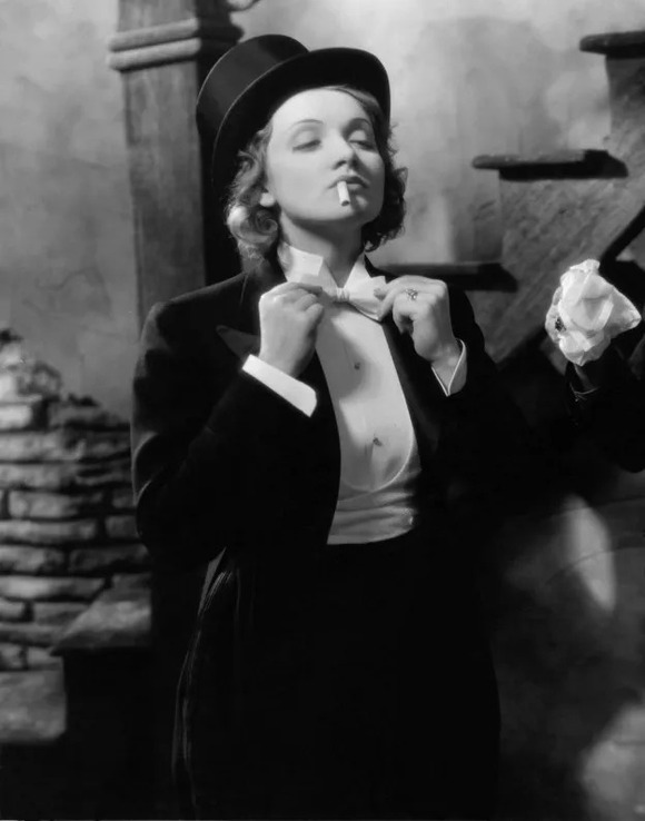 而关于穿男装,导演约瑟夫·冯·斯坦伯格曾说这段十足颠覆的镜头其实并非原创。作为吸烟装的鼻祖,生活中的玛琳就十分偏爱穿着男士西装套装。