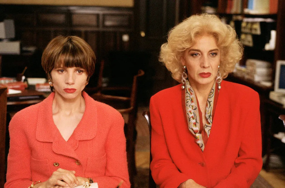 Power suit的出现,也让当时的影视圈颇为兴奋。之前讲香奈儿套装的时候我们提过阿莫的电影《情迷高跟鞋》。这部电影集结了两位欧洲时装大师同场飙戏。