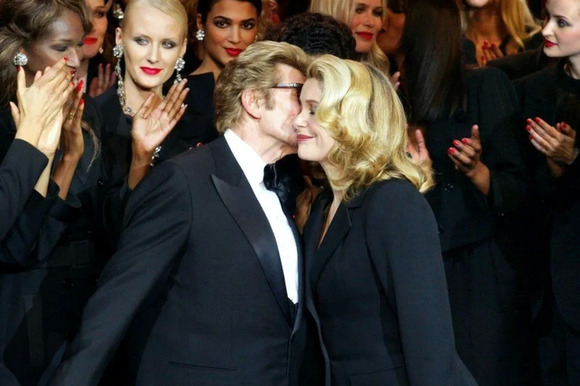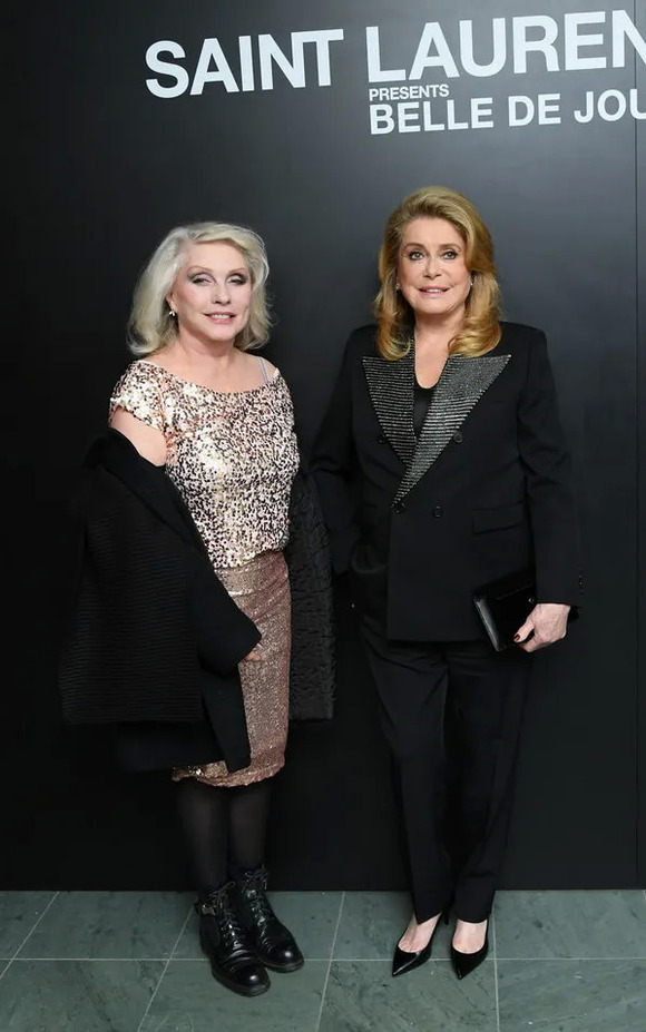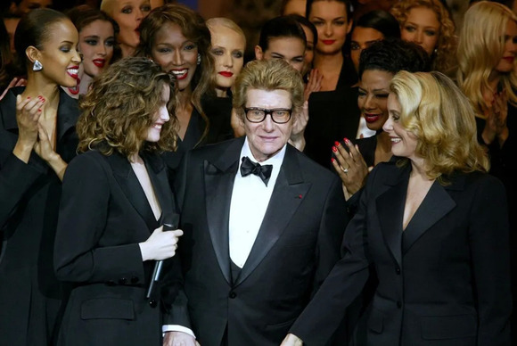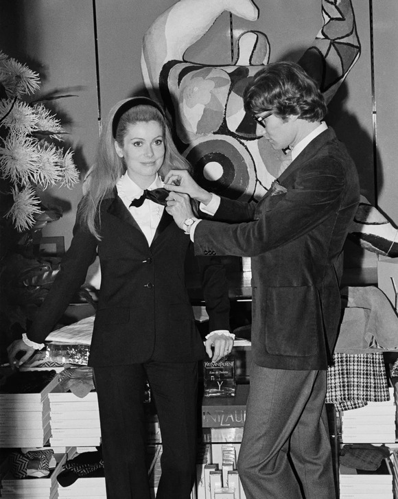 法国国民女神Catherine Deneuve是圣罗兰终身的缪斯,她也是最早演绎吸烟装的法国女星。2002年圣罗兰先生的最后一场高定秀上,设计师亲吻的也是她。