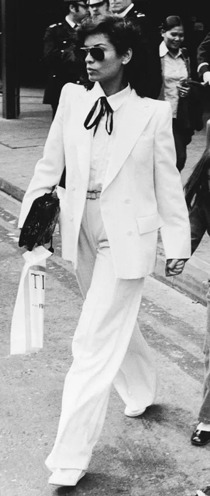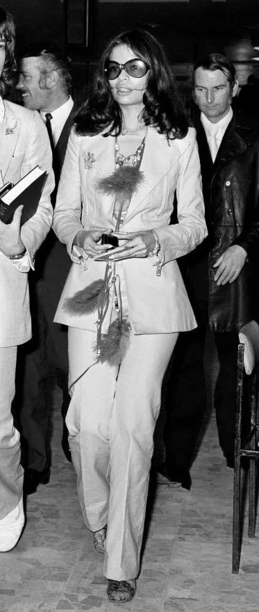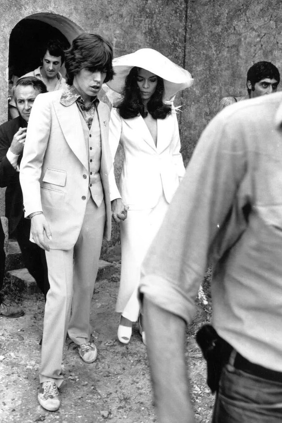 1971年,Bianca嫁给了大名鼎鼎的摇滚主唱Mick Jagger。在婚礼上她穿了一套YSL的白色吸烟装,突破常规,震惊世界,也影响了很多女生的婚纱选择。