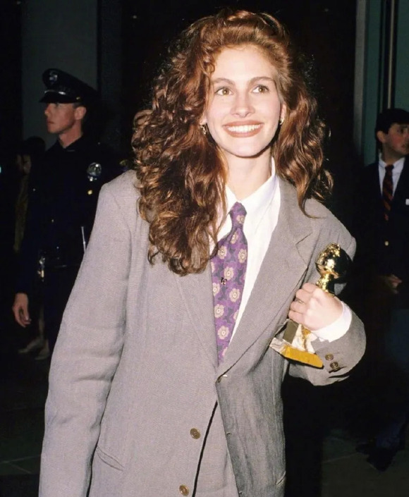 1990年的金球奖颁奖典礼,大嘴美人Julia Roberts穿着一身Armani的power suit摘得最佳女配。男士西装+爆炸头,让这一幕成为经典。
