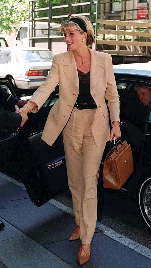 不止女明星,同样被大众视为穿衣榜样的戴妃也曾经多次在公开场合pick西装套装。比起女明星的大气场,戴妃穿的套装多了一分优雅。